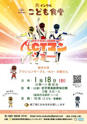 2026年1月のこども食堂のご案内 2025/12/23 今年もあと数日で終わりますね。来年は午年です。お馬さんのようにパッパカ走って、「うま」く進んで行きましょう!1月のこども食堂は、岩手大学アクションサークルの皆さんのActマンショーです。一緒に身体を動かすゲームも楽しみましょう。●日 時:2026年1月18日(日) 10時~11時30分(受付は9時45分~) ●会 場:(公財)岩手県高校教育会館3階 大ホール (盛岡市志家町11-13) ●定 員:50名(こども・保護者) お申し込み順で受付いたしますお申込みはこちらからどうぞ。 https://forms.gle/JdxY6FmJExQZw38L9◎→PDFはこちら