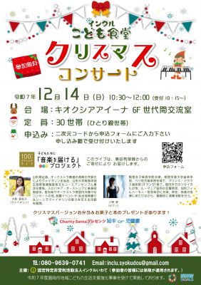 こども食堂 クリスマスコンサート 2025/11/14 クリスマスツリーが飾られ、クリスマスシーズンがやってきますね!今年もみんなでクリスマスの楽しい演奏を聴いて過ごしましょう。プレゼントもお楽しみにね!●日 時:令和7年12月14日(日) 10時30分~12時00分 ●会 場:キオクシアアイーナ6階 世代間交流室●定 員:30世帯(ひとり親世帯)●参 加 費:無料お申込みはこちらからどうぞ。 https://forms.gle/WE8YYARp9iFPi4Do6◎→PDFはこちら